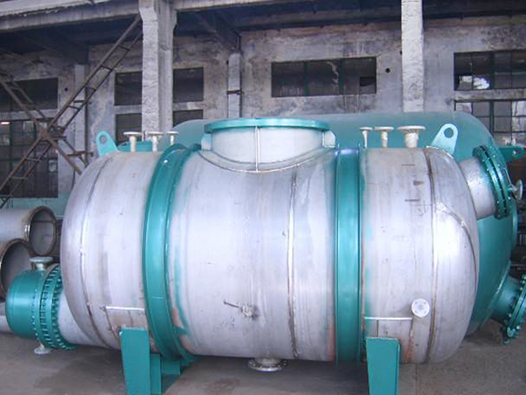 蒸餾釜,涉及一種化工生產(chǎn)中蒸餾所使用的釜。主要是為解決現(xiàn)有的蒸餾釜在生產(chǎn)過程中當(dāng)物料中含有固狀物及高沸點(diǎn)物時(shí)需間斷檢修清理的問題而設(shè)計(jì)的。它包括蒸餾釜?dú)んw,在蒸餾釜?dú)んw上方是上封頭,上封頭上有氣體出口,上封頭下方有除沫器,除沫器下方為貯料室,貯料室上部有進(jìn)料口,室內(nèi)設(shè)立式蒸發(fā)器,蒸餾釜下部為固狀物及高沸點(diǎn)物沉降室,在沉降室內(nèi)設(shè)攪拌器,攪拌器軸通過軸封與外部電機(jī)相連,蒸餾釜底部設(shè)固狀物及高沸點(diǎn)物排出口。優(yōu)點(diǎn)是可隨時(shí)排出固狀物及高沸點(diǎn)物,無須間斷檢修清理,保證生產(chǎn)連續(xù)進(jìn)行。